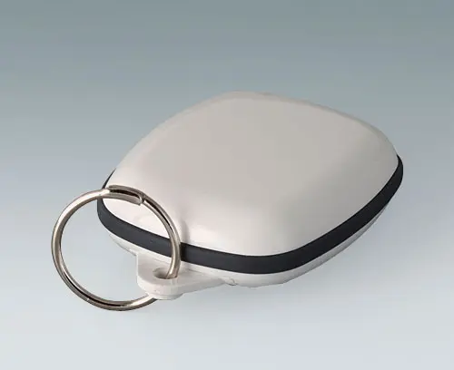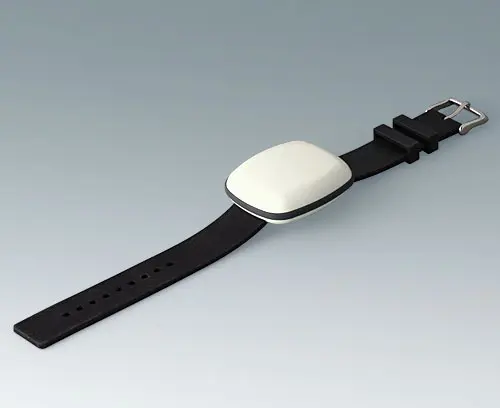 Modern small enclosure specifically designed for "wearable technologies". Three-part design consisting of highly polished top and bottom parts and a matt TPV sealing ring.