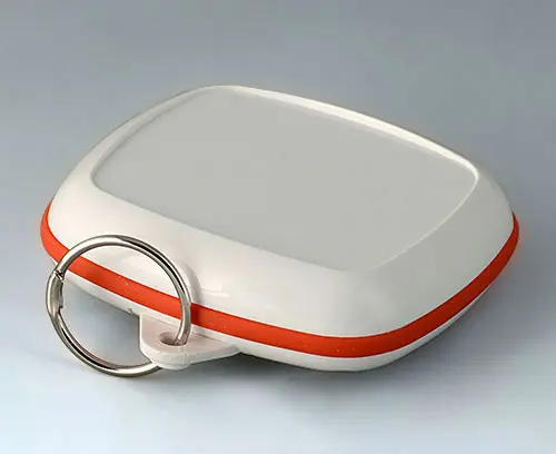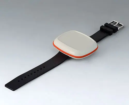 Modern small enclosure specifically designed for "wearable technologies". Three-part design consisting of highly polished top and bottom parts and a matt TPV sealing ring.