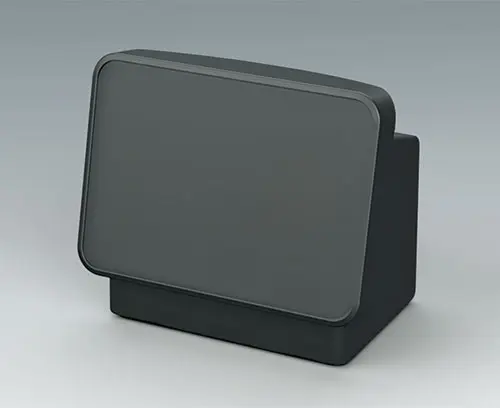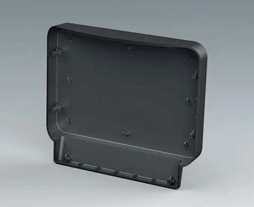 Order with COMMUNITEC S basic housing. Features a recessed area for protecting membrane keypads and integrating large-format displays up to 11.5", with a flat area below for front-mounted control elements and connectors. Includes integrated fastening pillars for PCBs or mounting plates. The operating panel is installed from the rear.