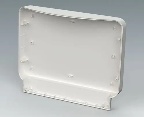 Order with COMMUNITEC M basic housing. Features a recessed area for protecting membrane keypads and integrating large-format displays up to 14", with a flat area below for front-mounted control elements and connectors. Includes integrated fastening pillars for PCBs or mounting plates. The operating panel is installed from the rear.