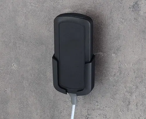 Special holder for CONNECT M for the secure storage of wired and wireless mobile devices. With large recess for plug-in connections. The holder is mounted on the wall or on other components with standard screws with head diameters of 0.217" to 0.276".