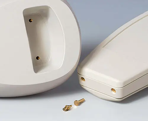 Domes for mounting PCBs and components. Recesses for spring contacts (accessories).