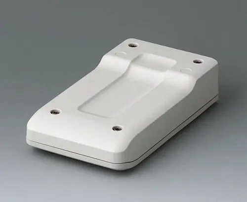 2-part compact hand-held enclosure with sealing and with an ergonomic, robust design. Secure grip through finger recess in the bottom part. Recessed user area to protect the operating elements. Attachment domes for PCBs and components in the top and bottom parts.