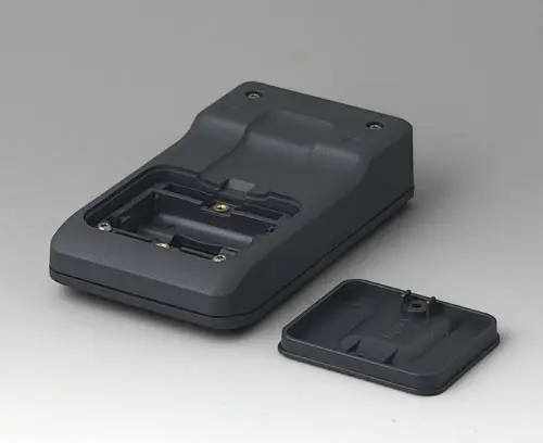 3-part compact hand-held enclosure with sealing and with an ergonomic, robust design. Ideal for miniaturised electronics applications. Secure grip through finger recess in the bottom part and centre of gravity near the body. With a battery compartment, accessible from the outside, for 3 x 1.5 V AAA batteries. Recessed user area to protect the operating elements. Attachment domes for PCBs and components in the top and bottom parts.