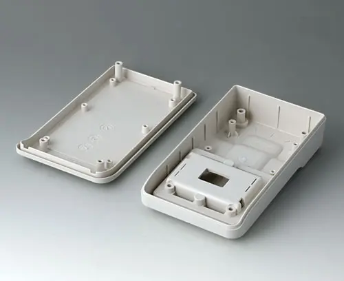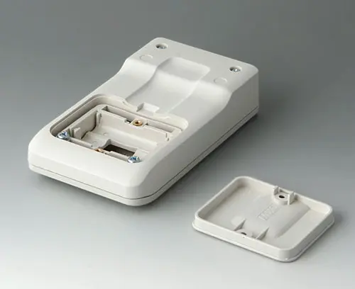 3-part compact hand-held enclosure with an ergonomic, robust design. Ideal for miniaturised electronics applications. Secure grip through finger recess in the bottom part and center of gravity near the body. With a battery compartment, accessible from the outside, for 3 x 1.5 V AAA batteries. Recessed user area to protect the operating elements. Attachment domes for PCBs and components in the top and bottom parts.