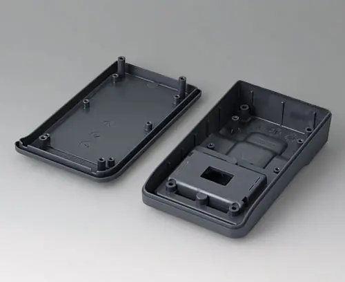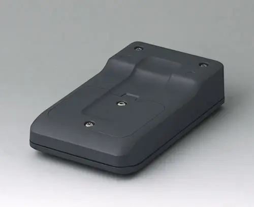 3-part compact hand-held enclosure with an ergonomic, robust design. Ideal for miniaturised electronics applications. Secure grip through finger recess in the bottom part and center of gravity near the body. With a battery compartment, accessible from the outside, for 3 x 1.5 V AAA batteries. Recessed user area to protect the operating elements. Attachment domes for PCBs and components in the top and bottom parts.