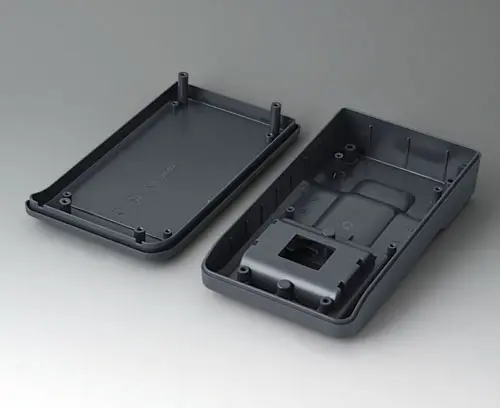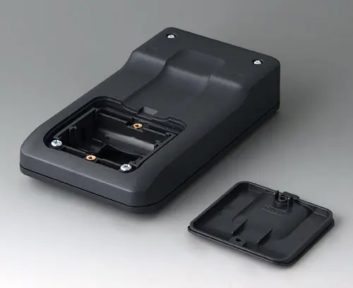 3-part compact hand-held enclosure with an ergonomic, robust design. Ideal for miniaturised electronics applications. Secure grip through finger recess in the bottom part and center of gravity near the body. With a battery compartment, accessible from the outside, for 3 x 1.5 V AA batteries. Recessed user area to protect the operating elements. Attachment domes for PCBs and components in the top and bottom parts.