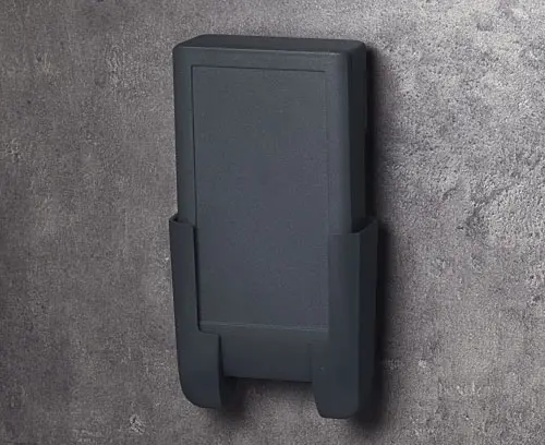 Special holder for DATEC-COMPACT M for the secure storage of wired and wireless mobile devices. With large recess for plug-in connections. The holder is mounted on the wall or on other components with standard screws with head diameters of 0.217" to 0.276".