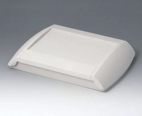 Four-part case. The bottom part can be fixed directly to the wall, the top part will be assembled by means of screws from the front. 2 side trims close the case. If required, the trims can also be locked, thus preventing unauthorized access. Recessed operating area to protect the membrane keyboard. Fastening pillars for PCBs in bottom and top part. Integrated supports for 2 x AA / 1 x 9 V.
