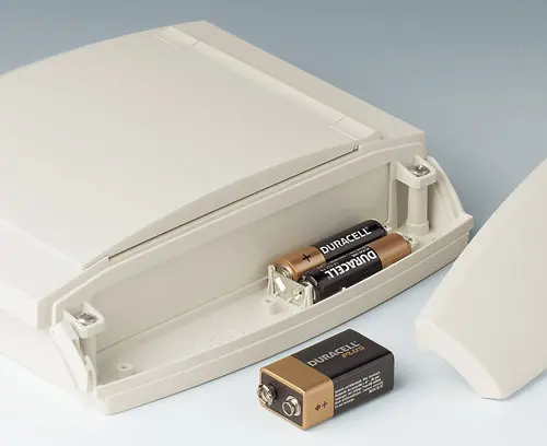 DIATEC M Four-part case. The bottom part can be fixed directly to the wall, the top part will be assembled by means of screws from the front. 2 side trims close the case. If required, the trims can also be locked, thus preventing unauthorized access. Recessed operating area to protect the membrane keyboard. Fastening pillars for PCBs in bottom and top part. Integrated supports for 2 x AA / 1 x 9 V.