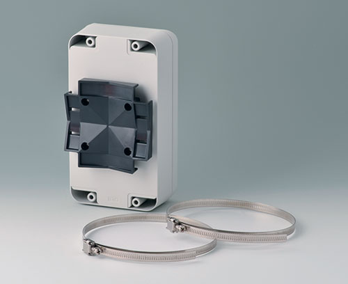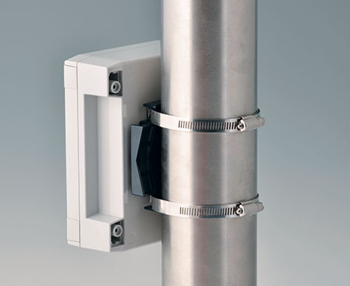 For the secure and stable mounting of IP rated electronic enclosures to poles, masts, and pipes using cable ties or stainless steel screw bands, suitable for pole diameters from 30 mm. The bracket is attached to the rear of the enclosure (four drilled holes required) and is manufactured from UV resistant material.