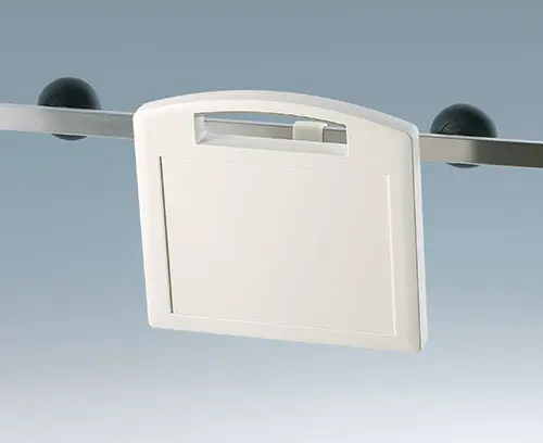 CARRYTEC L Robust plastic enclosure with handle. Recessed surface for membrane keyboards. Flat, impact-protected areas on the bottom part of the enclosure for installing interfaces, plug-in connectors, peripheral equipment etc. Interface installation at the rear, e.g. support arm applications, ensures orderly cable routing through enclosure connection, mounting points match the hole patterns of VESA MIS-D 100. Attachment domes for PCBs and components in the top and bottom parts. Stations for easy transmission of data and charging current, as well as battery compartment 5 x AA (processing on request) as an accessory.