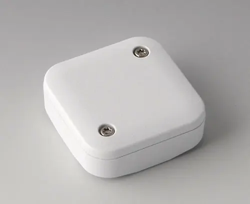 2-part plastic enclosure with flat top part, for universal use. Robust design with proven tongue and groove connection. Assembled with Torx stainless steel screws. Fixing supports for PCBs and components in the top and bottom parts. Fastening on the supports is by means of hot caulking.