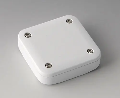 2-part plastic enclosure with flat top part, for universal use. Robust design with proven tongue and groove connection. Assembled with Torx stainless steel screws. Fixing supports for PCBs and components in the top and bottom parts. Fastening on the supports is by means of hot caulking.