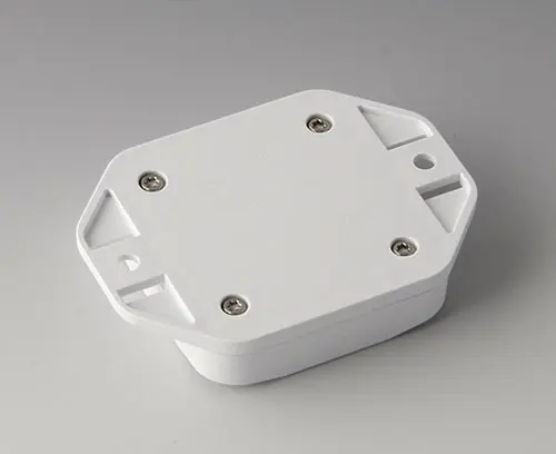 2-part plastic enclosure with flat top part. Bottom part with integrated flanges for fast wall mounting or for mounting on rails and tube profiles or on masts. Robust design with proven tongue and groove connection. Assembled with Torx stainless steel screws. Fixing supports for PCBs and components in the top and bottom parts. Fastening on the supports is by means of hot caulking.