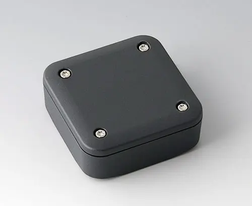 2-part plastic enclosure with high top part, for universal use. Robust design with proven tongue and groove connection. Assembled with Torx stainless steel screws. Fixing supports for PCBs and components in the top and bottom parts. Fastening on the supports is by means of hot caulking.