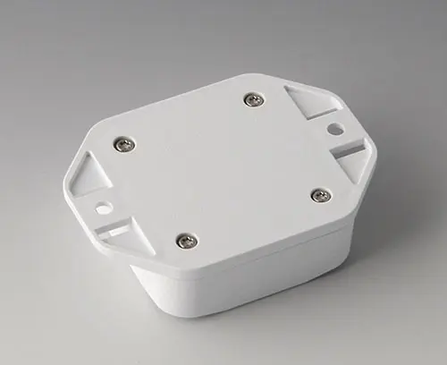2-part plastic enclosure with high top part. Bottom part with integrated flanges for fast wall mounting or for mounting on rails and tube profiles or on masts. Robust design with proven tongue and groove connection. Assembled with Torx stainless steel screws. Fixing supports for PCBs and components in the top and bottom parts. Fastening on the supports is by means of hot caulking.