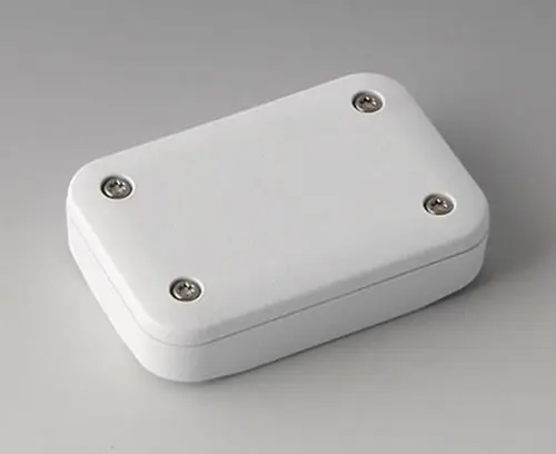 2-part plastic enclosure with flat top part, for universal use. Robust design with proven tongue and groove connection. Assembled with Torx stainless steel screws. Fixing supports for PCBs and components in the top and bottom parts. Fastening on the supports is by means of hot caulking.