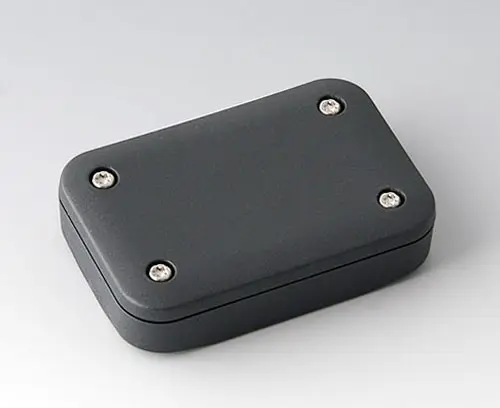 2-part plastic enclosure with flat top part, for universal use. Robust design with proven tongue and groove connection. Assembled with Torx stainless steel screws. Fixing supports for PCBs and components in the top and bottom parts. Fastening on the supports is by means of hot caulking.