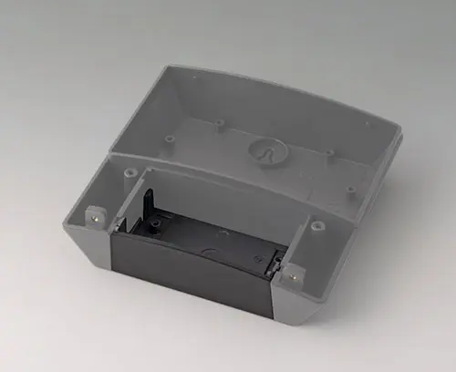 NET-BOX 140, Vers. I Three-part enclosure with a uniform appearance thanks to concealed screw connections. Modern color combination of light gray and lava. 2 PCB levels with 4 attachment domes each in the electronics compartment. Can also be used out of doors thanks to the high-quality ASA+PC-FR material.