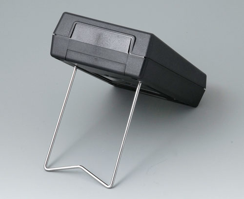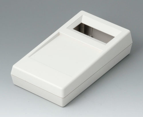 HAND-HELD-BOX P, Vers. I Successfully used case for measuring instruments. With recessed area for imprintings or your logo. Cut-out section for LCD or analogical modules. With battery compartment, accessible from the outside, for 9 V flat battery or 1.5 V baby cell (C) with contacts for soldering. Raised front area to accommodate plugs.