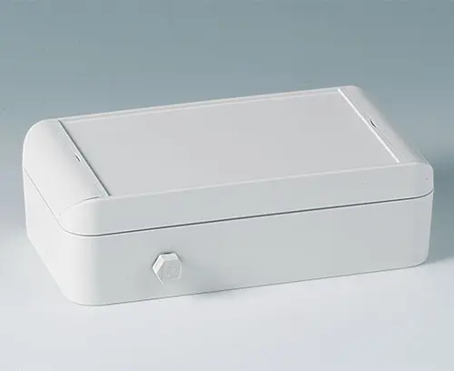 Two-piece plastic enclosure with sealing foamed into the top part. Recessed panel to protect membrane keyboards and design foils. Attachment domes for DIN rails, PCBs and mounting plates. Rational stainless steel quick-action lock outside the sealing area.