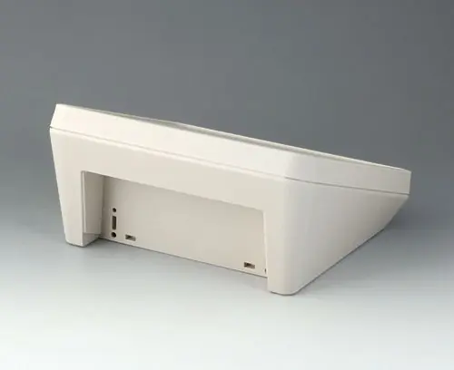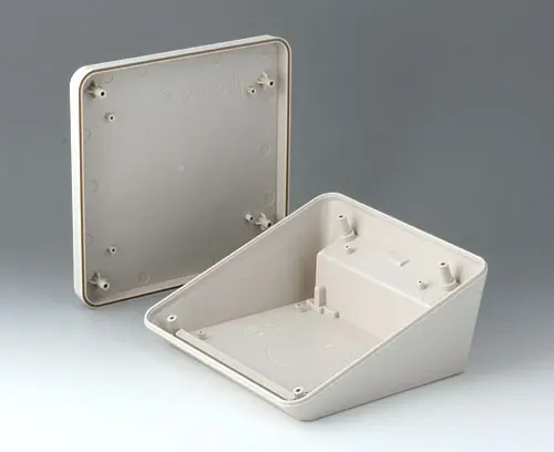 Modern two piece plastic enclosure with an ergonomically inclined operating panel. Fastening pillars for PCBs and components in the top and bottom parts. Recessed interface area. Wall suspension element and sealing (to raise the protection class up to IP 65) included in the range of accessories. Hidden stainless steel assembly screws with secure Torx heads. Can also be used outdoors thanks to the high-quality material and the robust design.