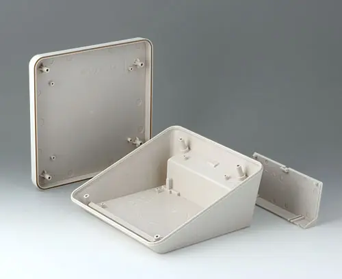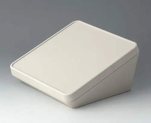 Modern three piece plastic enclosure with an ergonomically inclined operating panel. The snap-on cover included in the supply makes it possible to close the deep recessed interface area at the rear both visually and/or to install additional electronics in a separate area. Fastening pillars for PCBs and components in the top and bottom parts. Wall suspension element and sealing (to raise the protection class up to IP 65) included in the range of accessories. Hidden stainless steel assembly screws with secure Torx heads. Can also be used outdoors thanks to the high-quality material and the robust design.