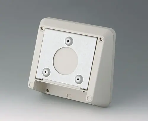 PROTEC 180, Vers. I Modern two piece plastic enclosure with an ergonomically inclined operating panel. Fastening pillars for PCBs and components in the top and bottom parts. Recessed interface area. Wall suspension element and sealing (to raise the protection class up to IP 65) included in the range of accessories. Hidden stainless steel assembly screws with secure Torx heads. Can also be used outdoors thanks to the high-quality material and the robust design.