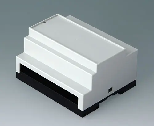 Enclosure for applications where larger components/assemblies need to be fitted inside. Different connection levels flat or high for individual configuration. Case corresponds to DIN 43880, size 1. Simple and quick assembly by locking onto DIN-rails EN 60715 TH35. Base part with fixing pillars for the PCB. Vertical and horizontal guides for additional PCBs.