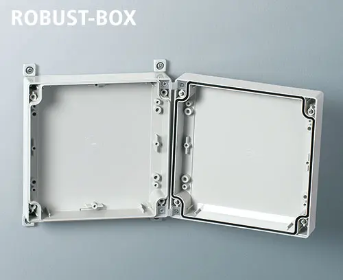 SOLID-BOX 175 Functional, high-quality industrial enclosure – robust, waterproof and stylish. Highly polished enclosure surface with design trims for concealed screw connection outside the sealed area. The seal is already inserted in the top part. Recessed operating area in the top protects a membrane keypad or design foil.