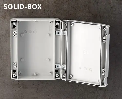 SOLID-BOX 145 Functional, high-quality industrial enclosure – robust, waterproof and stylish. Highly polished enclosure surface with design trims for concealed screw connection outside the sealed area. The seal is already inserted in the top part. Recessed operating area in the top protects a membrane keypad or design foil.