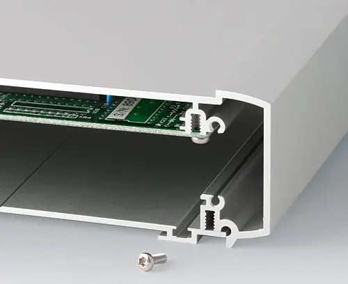 Horizontal guides and screw channels provided inside the case for fitting PCBs. Flat areas for easy installation of interfaces. Recessed area in the top for the protection of displays, membrane keypads and operating elements. Side covers with recessed area for protecting cables and connectors.