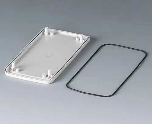 SLIM-CASE M, Vers. II 2-piece handheld enclosure, flat design, with a large operating panel of up to 4" (10 cm). The contours of the enclosure are rounded along the sides - comfortable to hold and easy to operate. Recessed operating panel for applications with decorative product labels. Fastening pillars for mounting PCBs in top and bottom parts. Seal for protection class IP 65 available as accessory.