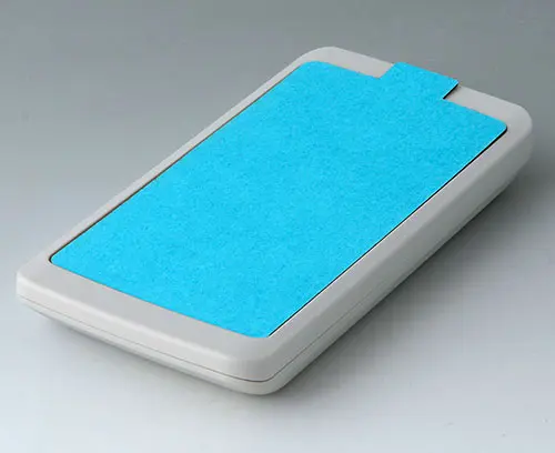 SLIM-CASE M, Vers. VI 3-piece handheld enclosure with TPE intermediate ring, compact design, with a large operating panel of up to 4" (10 cm). Comfortable grip thanks to enclosure contours that are rounded along the sides and intermediate ring made of TPE, which also serves as impact protection and as a sealing ring for protection class IP 54. Recessed operating panel for using a contoured transparent front screen (available as an accessory with adhesive film) or for protecting individual membrane keyboards. Fastening pillars for mounting PCBs in top and bottom parts.