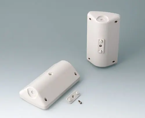 Two-part plastic enclosure with recessed panel to protect the membrane keypad / décor foil. The basic triangular shape allows it to be used in corners or at an ergonomically favourable angle of 45°. Robust design with proven tongue and groove assembly. Case assembled with Torx drive stainless steel screws. Protection class IP 40 without optional sealing kit. Fastening pillars for PCBs and components in the top and bottom parts.