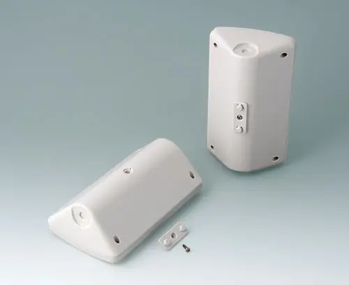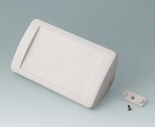 Two-part plastic enclosure with recessed panel to protect the membrane keypad / décor foil. The basic triangular shape allows it to be used in corners or at an ergonomically favourable angle of 45°. Robust design with proven tongue and groove assembly. Case assembled with Torx drive stainless steel screws. Protection class IP 40 without optional sealing kit. Fastening pillars for PCBs and components in the top and bottom parts.
