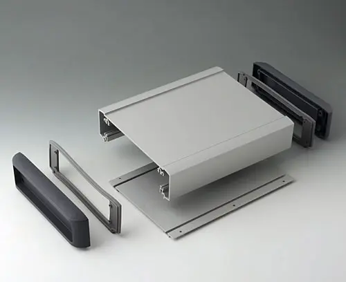 Horizontal guides and screw channels provided inside the case for fitting PCBs. Flat areas for easy installation of interfaces. Recessed area in the top for the protection of displays, membrane keypads and operating elements. Side covers with recessed area for protecting cables and connectors.