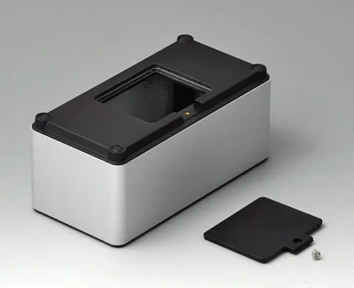 4-part enclosure for many different applications. Sturdy frame made of aluminum, glass bead-blasted and anodized. Plastic parts made of ASA+PC-FR with good UV resistance and high flame resistance. Attachment domes for PCBs and components in the top and bottom parts. Top part with recessed surface to protect the membrane keyboard. Bottom part with opening and screw-down cover: practical for the use of a battery compartment or for access to the interior, e.g. for a memory card or batteries that are mounted directly on the PCB. Battery compartment kit 3 x AA with contact springs, battery clips, button cell holder and wall mounting option as accessories.