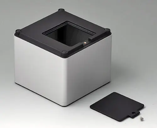 4-part enclosure for many different applications. Sturdy frame made of aluminum, glass bead-blasted and anodized. Plastic parts made of ASA+PC-FR with good UV resistance and high flame resistance. Attachment domes for PCBs and components in the top and bottom parts. Top part with recessed surface to protect the membrane keyboard. Bottom part with opening and screw-down cover: practical for the use of a battery compartment or for access to the interior, e.g. for a memory card or batteries that are mounted directly on the PCB. Battery compartment kit 4 x AA with contact springs, battery clips, button cell holder and wall mounting option as accessories.