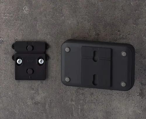 The adapter (1.77" x 2.28") is attached to the enclosure with a double-sided adhesive foil*. This makes it possible to mount the enclosure quickly and easily on the holder, which can be screwed to the wall - attachment with adhesive foils* is optionally also possible here (separate article available as an accessory). Removal protection by means of a locking pin.